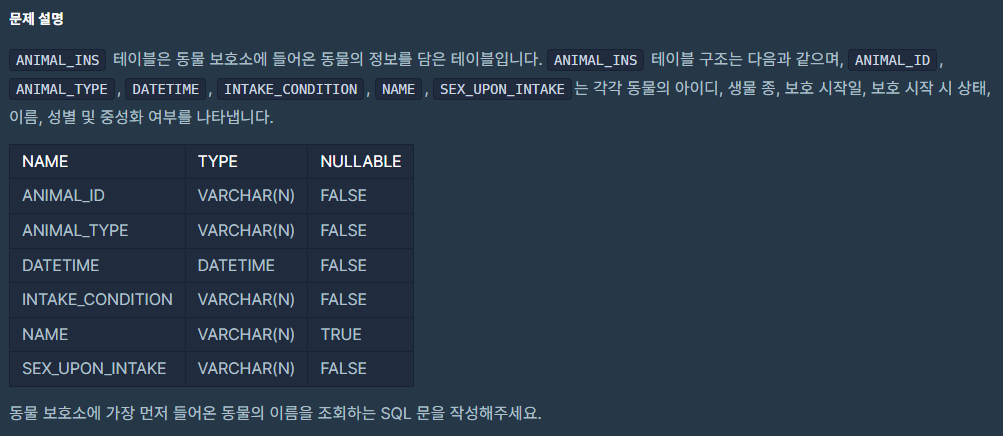 SELECT NAME FROM ANIMAL_INS ORDER BY DATETIME LIMIT 1;